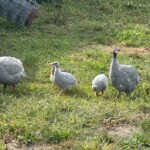 Guineas are lively, vocal birds who warn the flock of any perceived danger. If a hawk or eagle flies over, they are quick to call out their warning to coax the flock under shelter such as their coops. They also love to wander making quick work of all the ticks or beetles (really any bug will do) in the area. They have been known to “yell” at the dogs trying to get them to move so they could investigate their area for any delicious morsels. The dogs do not cooperate very often. But the guineas keep trying. They have become a delightful, yet noisy, addition to the flock.