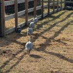 New to our flock in 2024 are the guineas. These silly birds go all over the pasture, flock yard and paddocks gobbling up as many bugs as they can. They like to antaganize the Preanese by settling on the fence rail and “yell” down at them. I think they are asking them to move so they can explore for more bugs. It doesn’t work. Athena and Mariam chase them away from their herd.