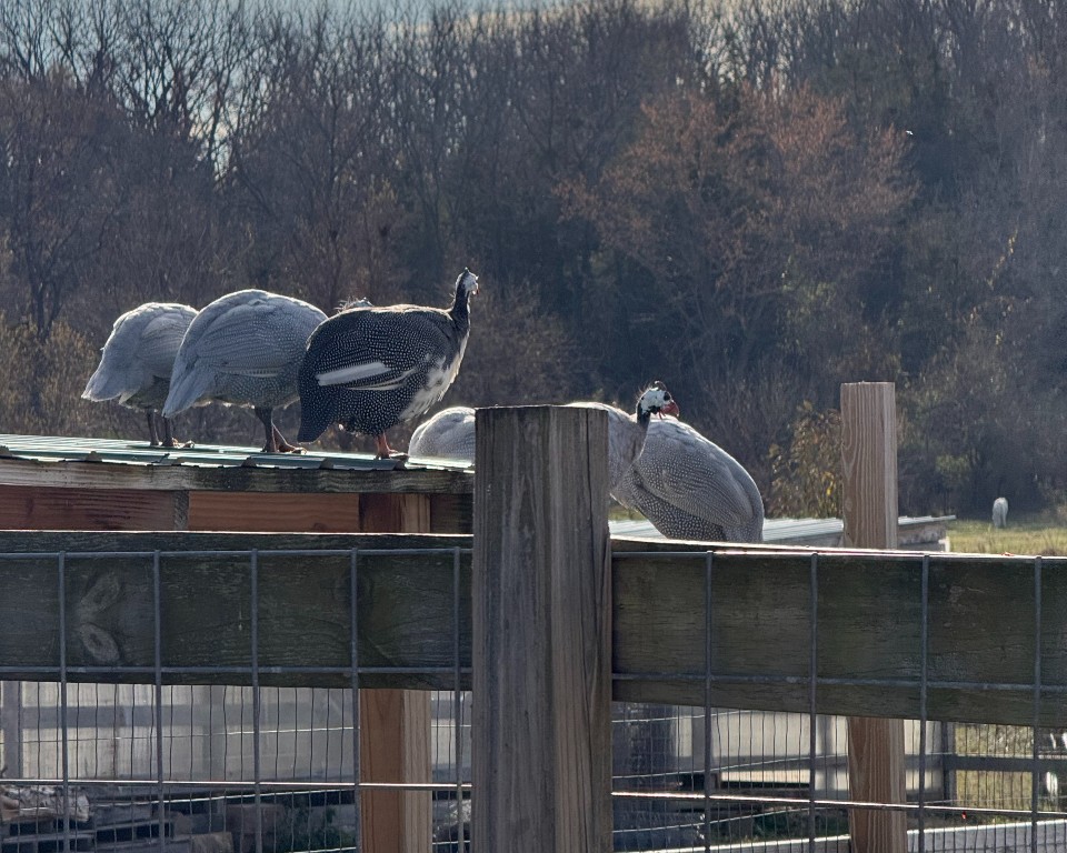 New to our flock in 2024 are the guineas. These silly birds go all over the pasture, flock yard and paddocks gobbling up as many bugs as they can. They like to antaganize the Preanese by settling on the fence rail and “yell” down at them. I think they are asking them to move so they can explore for more bugs. It doesn’t work. Athena and Mariam chase them away from their herd.