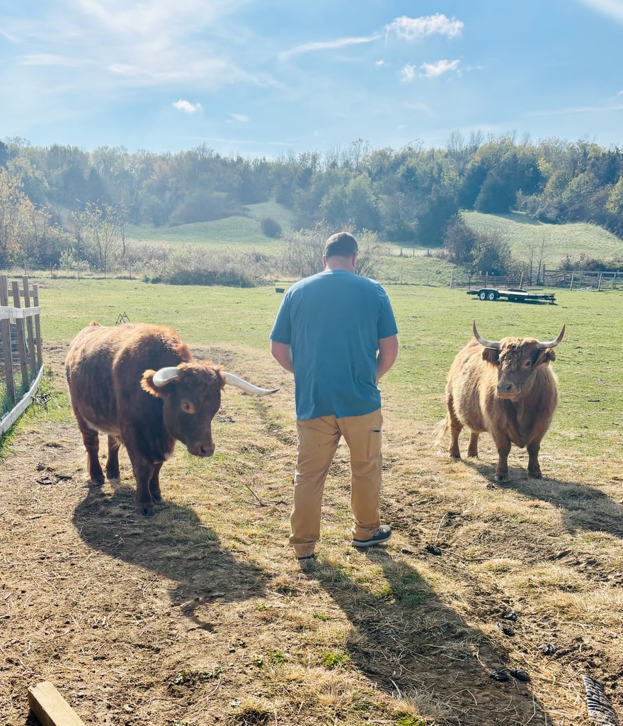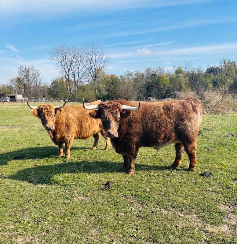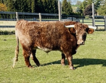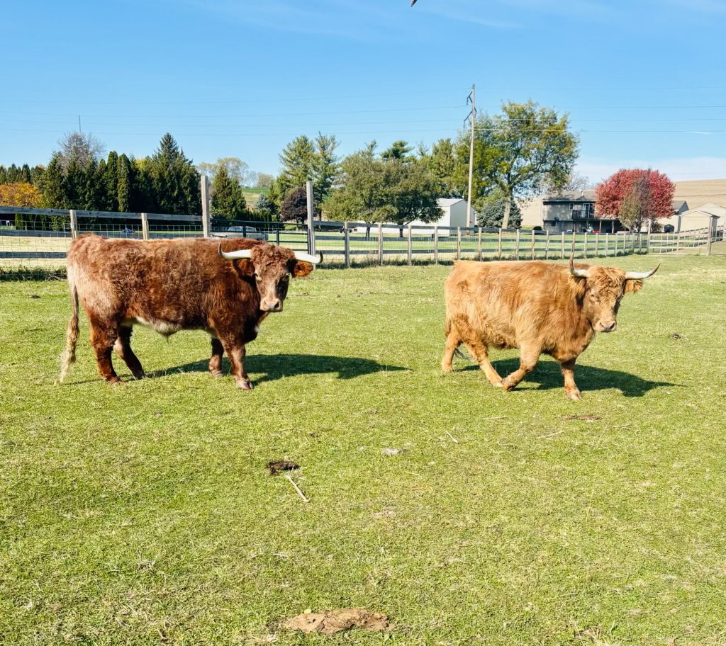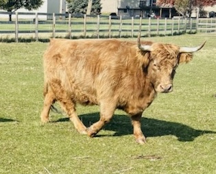 Duncan is our miniature highland steer mixed with English white.  He will reach an approximate height of  42 inches as well. We picked him up along with Espen in June of 2021.  He was more timid at first compared to Espen, but soon settled in.  Oh boy, when he settled in nothing was off limits.  I didn’t expect  cattle to be as curious as they are, Duncan is curious.  He, more than once, gotten into our tack room, which was closed off, and got stuck in there.  Poor baby!  But that did not stop him, he finds ways into the feed room and together with Espen will knock over the feed cans in an attempt to eat as much as they want.  He will push open the room with the hay stored and help himself…can you see the theme?  Yes, he is motivated by food.  Once on the pasture, he loves to zoom about as well.  He and Espen are quite the sight!